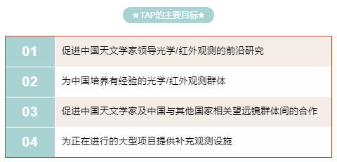 此前,中国天文学家或者通过合作,或者出国访问,或者在少数几家机构申请少量开放时间。TAP将首次让所有中国天文学家都可以通过开放和竞争的方式分配使用3.6-6.5米口径的光学/红外设备。需要强调的是,这不仅是为了获得望远镜的使用时间,更为了促进中国天文学家之间以及与不同国际社会之间的相互交流。