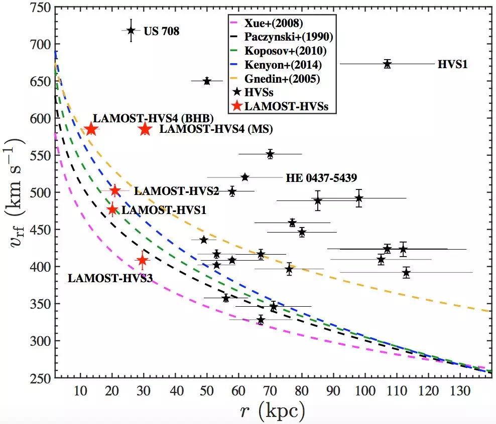 图2:速度vs距离图。图中五条彩色的虚线展示了五种引力势能模型下不同距离处的逃逸速度;红色五角星给出了LAMOST发现的四颗早型星的距离和速度(分别展示了LAMOST-HVS4为主序和BHB时的位置);黑色的五角星展示了前人发现的超高速星的速度和距离。