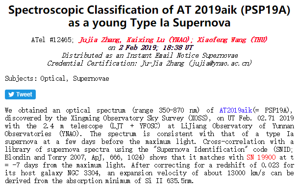 2月2日晚,云南天文台张居甲、卢开兴及清华大学王晓峰先生利用丽江观测站2.4米望远镜拍摄光谱,并发布Atel 12465号公报,确认这一发现目标为一颗年轻的Ia型超新星,宿主星系即NGC 3304。