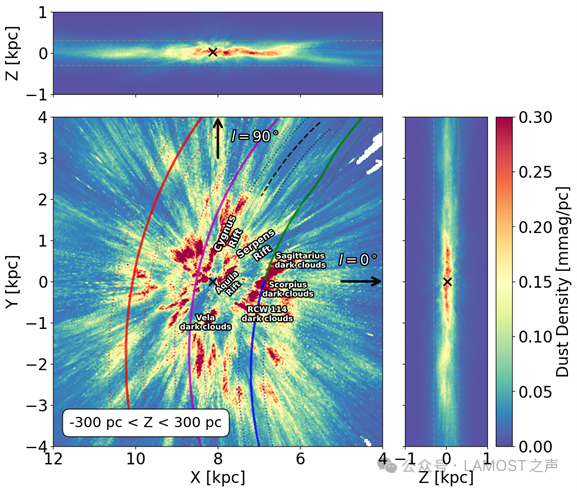 图3:银河系鸟瞰图XY平面的尘埃密度分布,太阳位于距银心8.12 kpc处(以黑色“×”符号标示)。图中同时标示了银经方向 l = 0° 和 l = 90°。实线和虚线曲线分别表示旋臂的中心位置及其±1σ宽度,从左至右依次为:英仙臂、本地臂、本地臂支臂和人马-船底臂,数据源自Reid et al(2019)利用脉泽测量所得的旋臂位置。顶部图:XZ平面内的尘埃密度分布。右侧图:YZ平面内的尘埃密度分布。