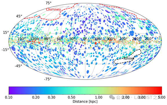 图4:识别出的分子云的银道坐标系下的分布。圆圈大小代表角半径,颜色表示分子云到太阳的距离。红色虚线勾勒出的空洞区域对应于Neill et al(2024)所识别的“烟囱”(chimney)结构,被解释为本地泡(Local Bubble)的一个银河北部的垂直开口。同一研究中描述的“隧道”(tunnel)特征则由黑色虚线标出,分子云的识别暗示,本地泡的南侧可能有更广阔的开口,或者说本地泡可能是南北贯通的。