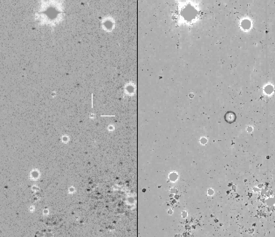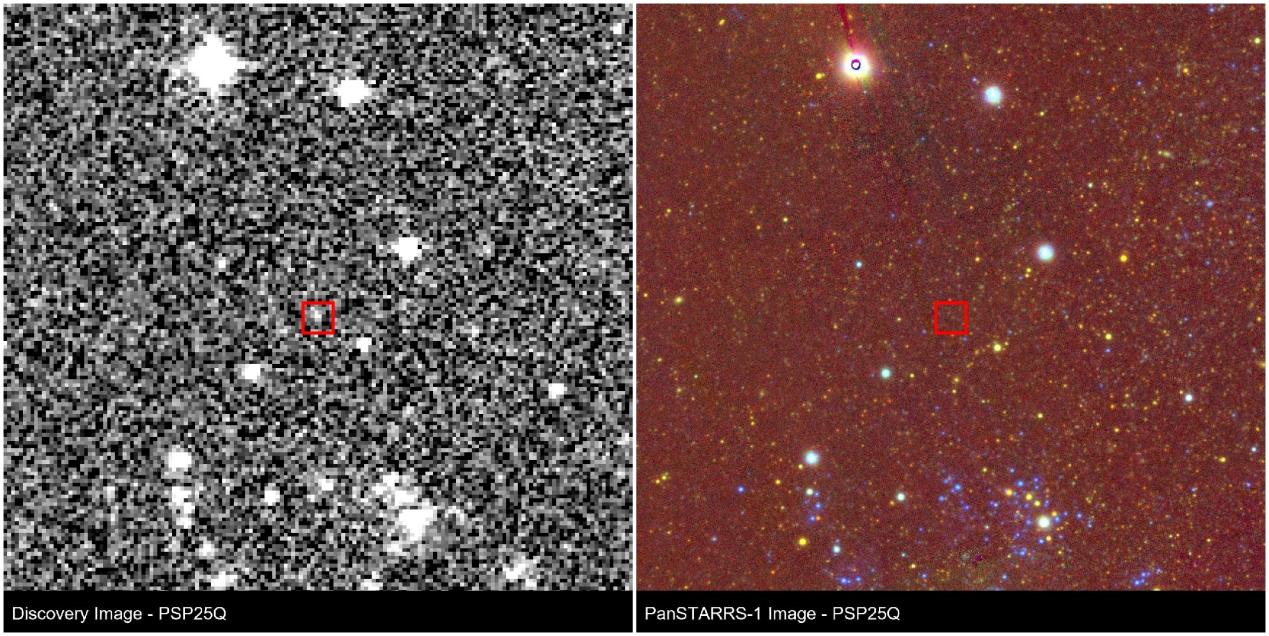 图1 PSP发现图像(左)中心方框处可见星点,而该星点在Pan-STARRS DR1的历史图像(右)中不可见。综合考虑位置和亮度,初步判断为河外新星候选体