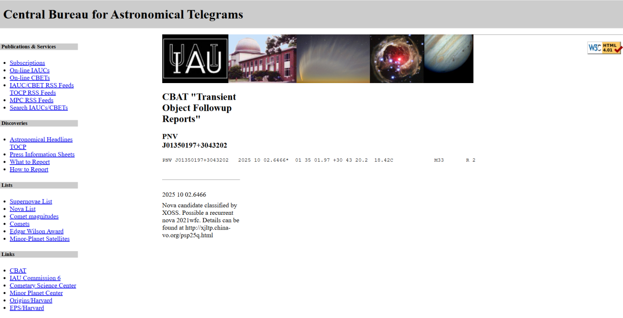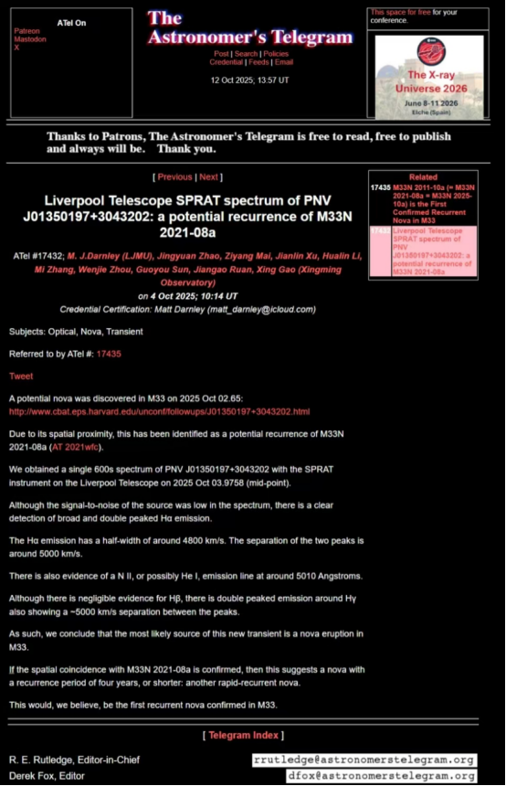 一颗新星候选体于世界时2025年10月2.65日在M33星系中被发现:http://www.cbat.eps.harvard.edu/unconf/followups/J01350197+3043202.html