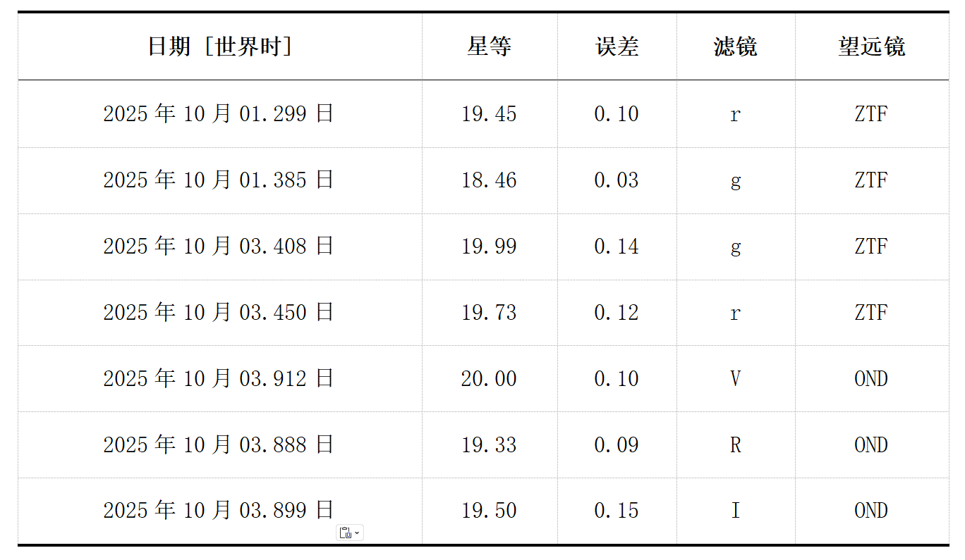 这些再发新星爆发的发现促使我们检查M33的历史图像,以搜寻更多的爆发事件。或许并不出人意料,在近期爆发的位置附近,我们在PTF于世界时2011年10月8.172日拍摄的M33历史图像中发现了一颗此前未知的新星。这次早期爆发的日期约在2021年爆发前10年,是最近两次爆发间隔4.1年的两倍多。如比对图面板2所示,这颗新发现的新星(我们将其命名为M33N 2011-10a)确实与最近的两颗新星在空间位置上重合。总而言之,新发现的M33再发新星系统M33N 2011-10a现在有三次已知的爆发,目前正在对M33的历史数据进行进一步搜寻。最后,我们报告近期爆发(M33N 2025-10a)的以下亮度,这些数据由ZTF和昂德列约夫0.65米望远镜(OND)测量得到: