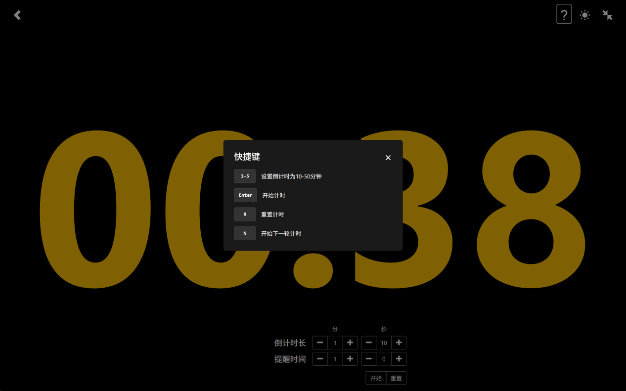 - 快速预设:按数字键 1 至 5,可直接设定 10 / 20 / 30 / 40 / 50 分钟倒计时(亦支持自定义输入)。