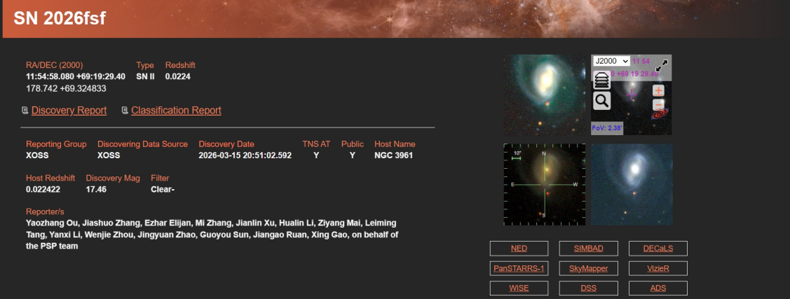 2026年3月16日16时许,公众超新星搜寻项目(PSP)参与者区耀樟、张家硕、伊兹哈尔伊力江,通过他们自主编写的自动检测程序,在SAC NGC 3961.fts5图像中发现一颗可疑目标,该目标亮度17.46星等(无滤镜),位于天龙座方向的NGC 3961星系。随后他们将该候选体的信息发给了项目管理员,多位管理员查验后均确认该目标真实存在,且历史影像中无对应天体,是未知的暂现源。不久之后,该候选体被上报至暂现源名称服务网(TNS),获得暂现源编号AT 2026fsf,内部编号PSP26I。与以往的人工筛查不同,本次发现是参与者(非管理员)通过自主开发的程序完成的目标自动筛查,这在PSP历史上是首次。