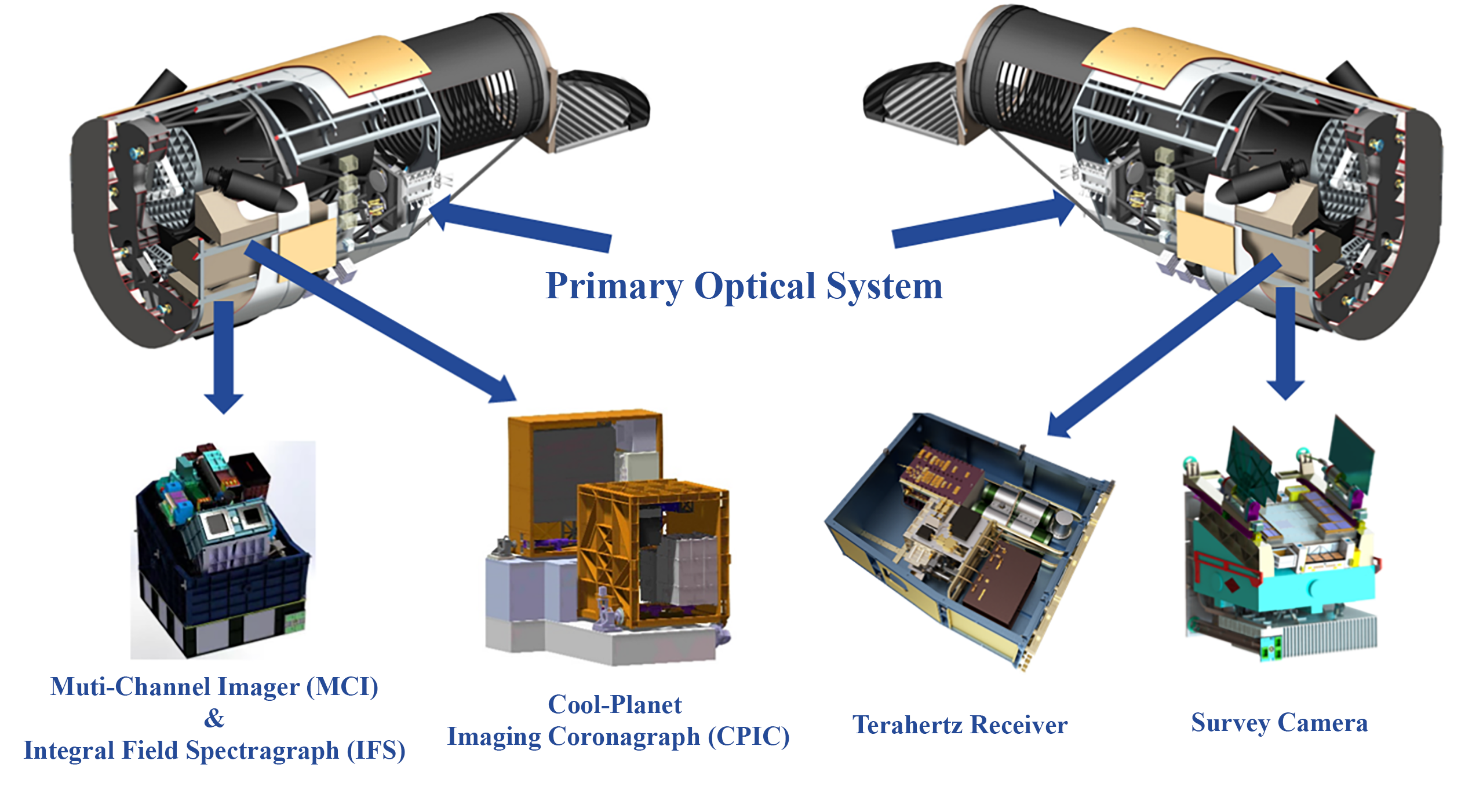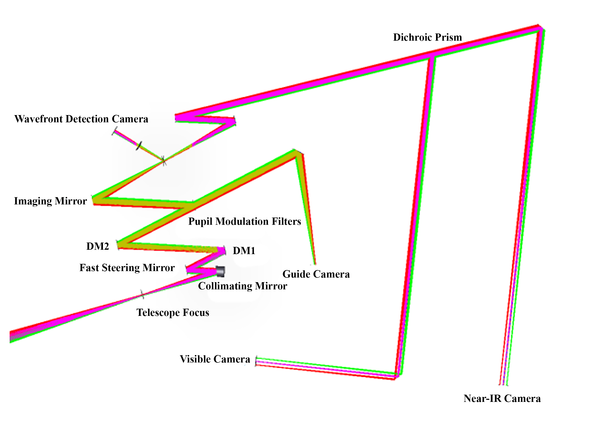 The telescope reflects light through a three-in-one mirror to the Exoplanet Coronagraph Instrument system and forms an image at the telescope focus. Collimating mirror 1 collimates the light and reflects it successively to the fast steering mirror and two sets of thousand-element deformable mirrors. The beam splitter behind deformable mirror 2 splits the light into two beams: one transmitted beam forms the guide star path and is guided into the guide camera (field of view 20″ x 20″) by imaging mirror 3, while the other reflected beam undergoes subsequent wavefront detection and scientific imaging (field of view 10″ x 10″). The reflected light passes through Pupil Modulation Filters, performing amplitude modulation and phase correction of the pupil energy, respectively.At the focus of imaging mirror 1, a beam splitter is placed for spectral splitting: one beam of light forms the wavefront detection camera path, achieving wavefront detection by introducing a collimating lens and micro-lens array. The other beam of light forms the near-infrared camera path, using collimating mirror 2 and imaging mirror 2 in conjunction, and realizes observations in the corresponding working wavelength bands through a Dichroic prism in front of the visible/infrared detector, combined with a filter wheel.
