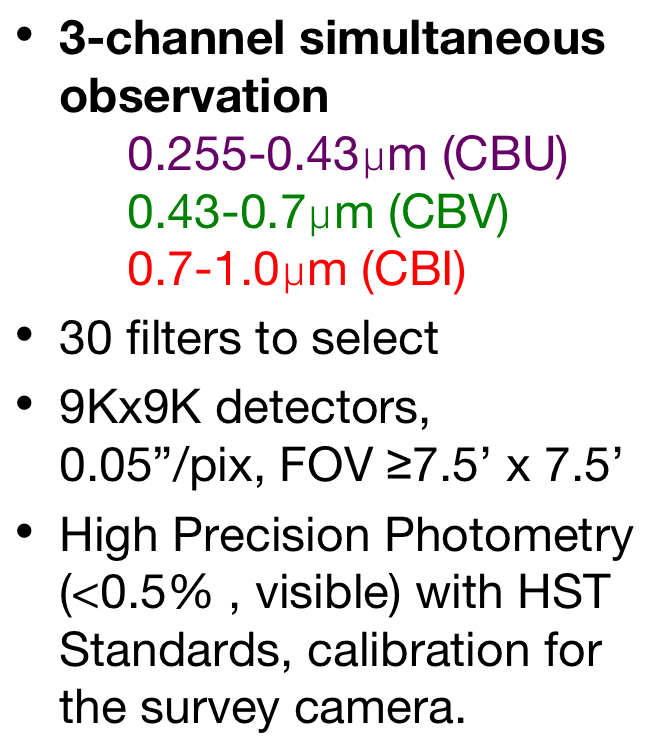 To achieve ultraviolet deep field detection and high-precision photometry with the Multi-Channel Imager (MCI), a two-stage imaging design is employed based on the primary optical imaging. This design involves adjusting the focal length and using a combination of color filters and spectral filters to obtain multiple spectral imaging channels. The detector adopts a 9K*9K 10μm CCD or CMOS device, coupled with a fast shutter mechanism, to achieve high-precision flux calibration and ultra-deep field observations.