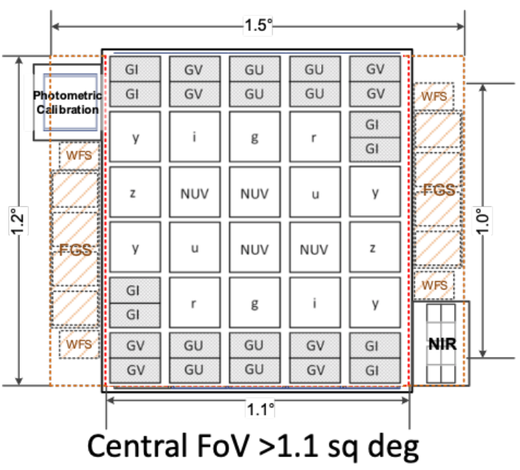 The multicolor imaging subsystem covers a wavelength range of 0.255µm to 1.0µm, including at least 6 bands (NUV, u, g, r, i, z, and +y band).